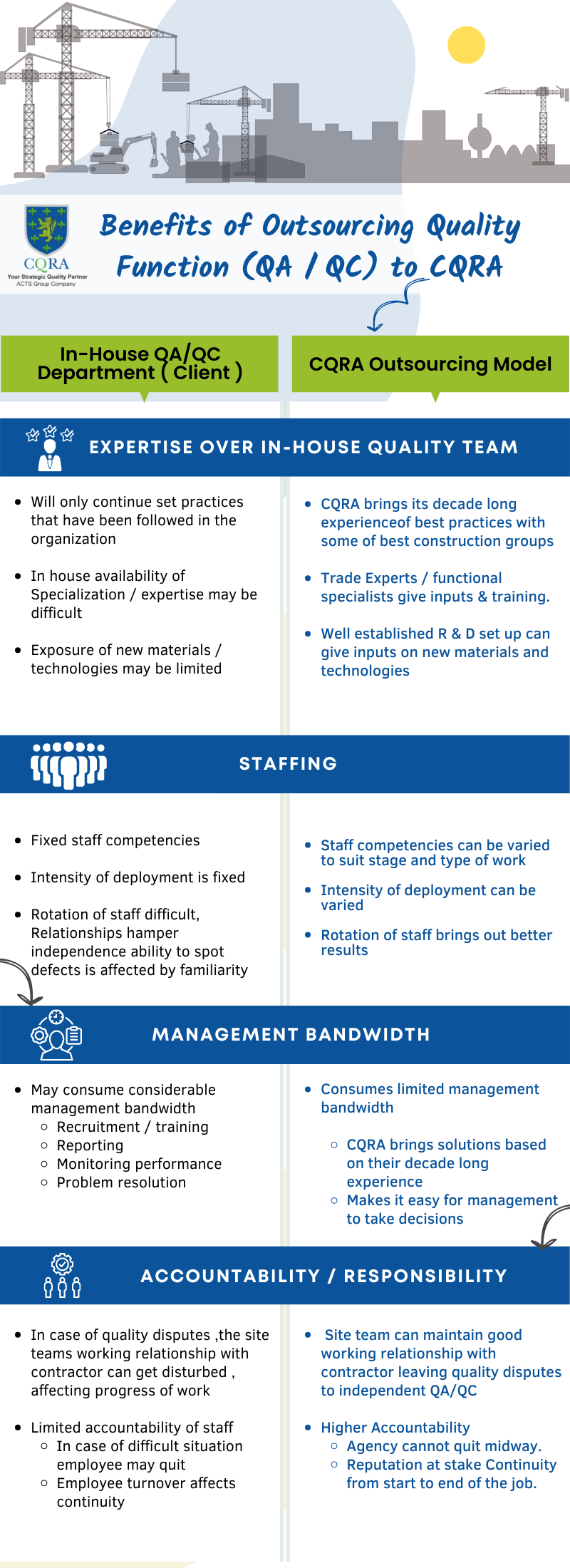 QA / QC staff directly under construction management team presents a conflict of interest where quality issues are likely to be compromised in favour of immediate milestone targets. Developers can outsource the QA/ QC function to CQRA even when engaging professional project management services, in order to make them accountable for quality.