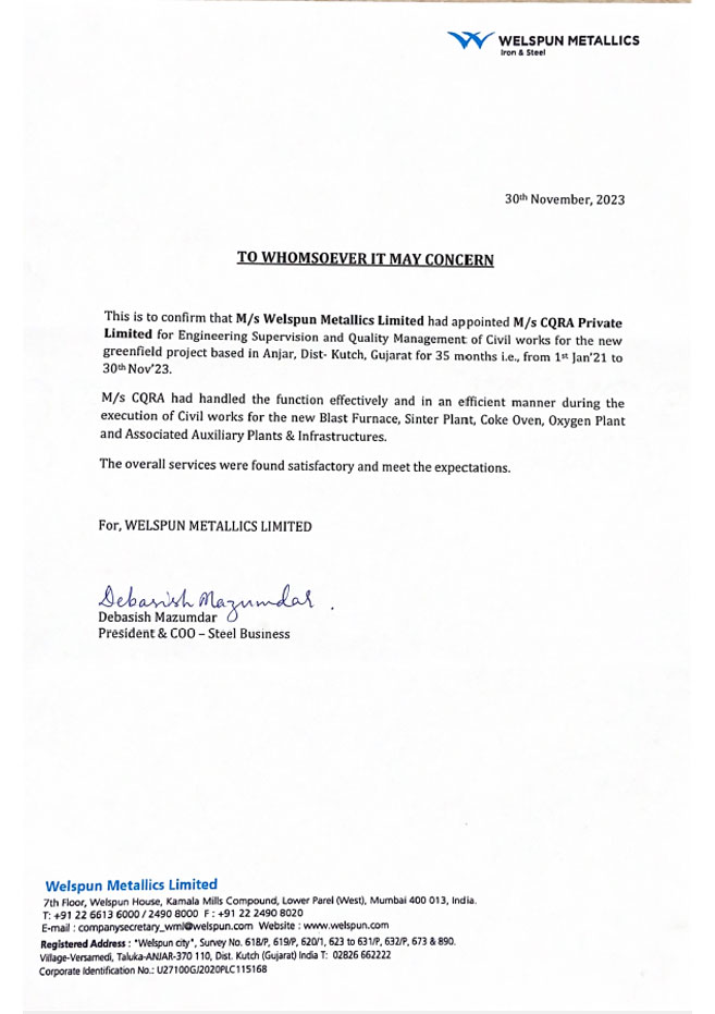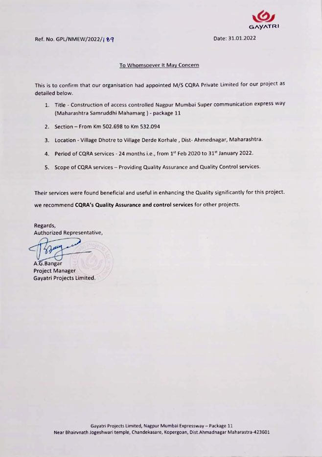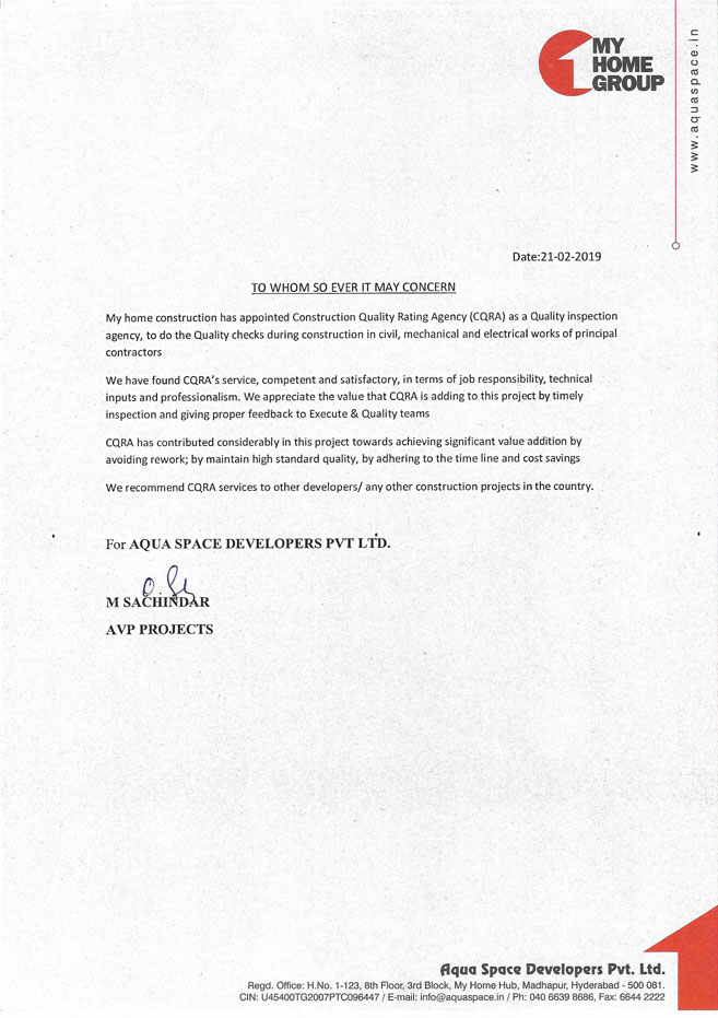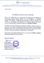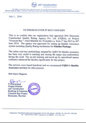 - L&T Metro Rail (Hyderabad) Ltd. L&T Metro Rail (Hyderabad) Ltd. has signed on CQRA Pvt. Ltd. as the Quality Inspection Agency. Their responsibility is to conduct quality checks in the civil, mechanical and electrical works of L&T Metro Rails principal construction. We at L&T Metro Rail have found CQRA Pvt. Ltd. absolutely competent and satisfactory in terms of job responsibilities, technical inputs and professionalism. We appreciate the value that CQRA is adding to this project with regular inspections and timely feedback to our execution & quality teams. We definitely recommended CQRA’s service to other Metro Rails or any other major construction & infrastructure projects in India.