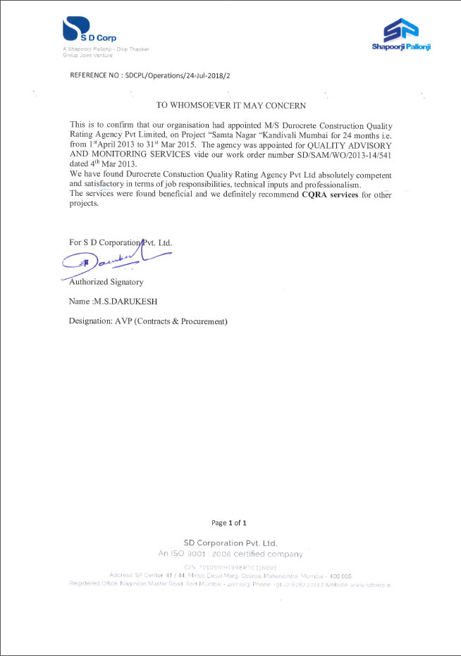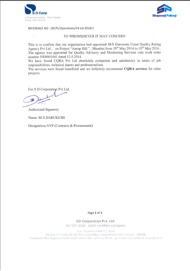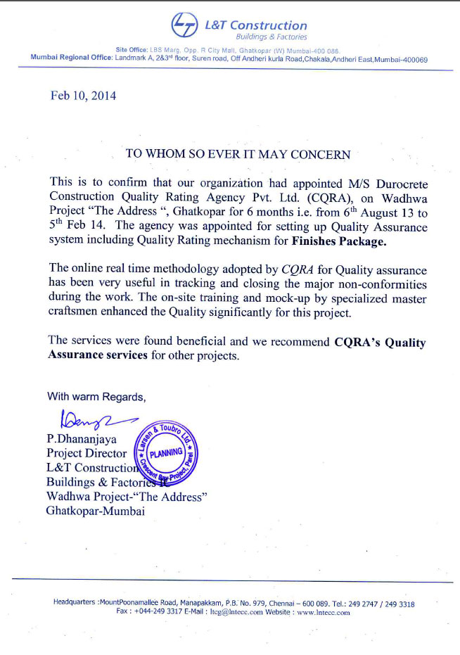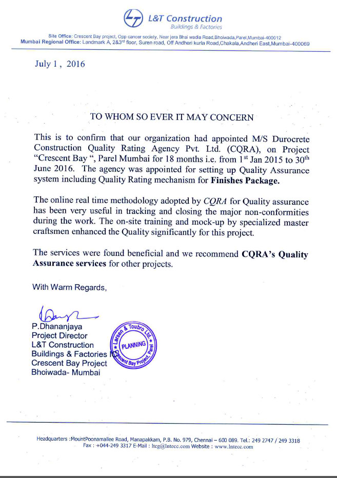 - ORBIT M/s Durocrete Construction Quality Rating Agency Pvt. Ltd. (CQRA) have been working with us on our prestigious Projects in Mumbai namely Villa Orbit and Orbit WTC for the last 2.5 years and have offered their Construction Quality Audit Services. We are happy with their valuable services and efforts to improve the building construction quality in all respects and have offered them further assignments. We have no hesitation in recommending them for similar Consultancy assignments.