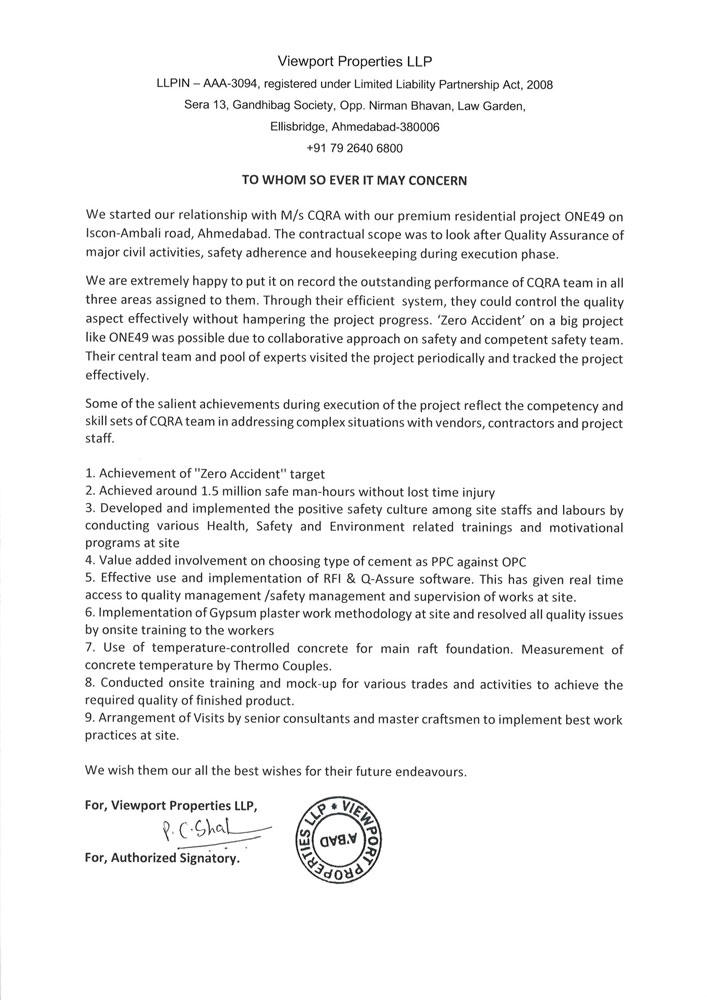 - Naiknavare Developers Pvt. Ltd For us at Naiknavare, quality checks and audits are of prime importance. When we heard of CQRA Pvt. Ltd. we decided to partner with them for our building projects in Pune. CQRA Pvt. Ltd. has provided its Construction Quality Audit Services for our projects like Victoria Garden at Kalyaninagar and Mystic Moods at Vimannagar which were both large scale projects. Their proficient approach and timely feedback helped us improve our overall quality offering making our end users happy. We definitely feel that quality ratings in constructions should be made mandatory and companies like CQRA Pvt. Ltd. should be applauded for their focus on construction quality improvement.